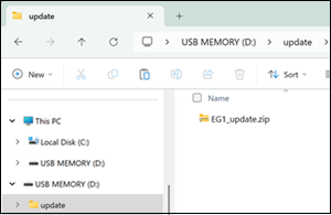 - Confirm that the EG1_update.zip file exists in the update folder on the USB storage device. Once confirmed, the update file transfer is completed and you can proceed to Step 2: Update the Software of This Unit.