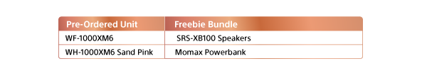 1. Customers may avail of the Sony WF-1000XM6 and WH-1000XM6 Sand Pink pre-order promotion from participating dealers starting February 13, 2026 to March 15, 2026. 2. Customers may avail of the Sony WF-1000XM6 and WH-1000XM6 Sand Pink pre-order promotion from participating dealers starting February 13, 2026 to March 15, 2026. 3. Full payment should be settled on or before March 30, 2026. Failure to do so will subject the pre-order reservation to cancellation and the down payment will be forfeited. Preorder price of WF-1000XM6 is P18,999 and WH-1000XM6 Sand Pink is P23,999. In any case that Sony Philippines Inc. is not able to give the pre-ordered units by March 30, 2026, all payments made by the customer shall be refunded. 4. Customers must present their collection receipt to claim the pre-ordered unit from the same outlet where they have reserved the unit. 5. Claiming of pre-ordered unit will start on March 16, 2026 until March 30, 2026. A freebie bundle will be included upon claiming of pre-ordered units: 6. Customers cannot choose the color of the freebie bundle nor exchange it to another item of similar value. All freebies should immediately be tested upon customer’s receipt of the item in-store.
