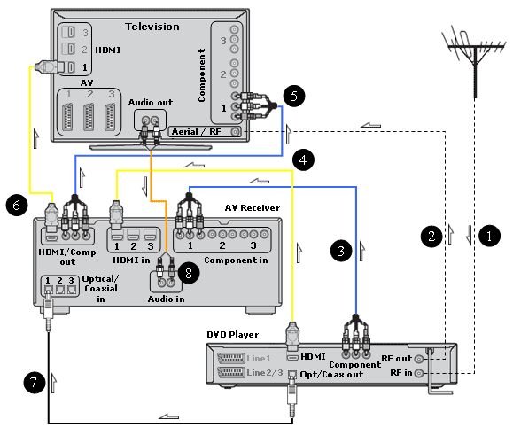 The below diagram shows the most common connections for your configuration. For each connection type, a colour is used to make the diagram easier to understand. More information on connection types can be found here. Choose your preferred type of connection or quality level from the diagram below, but remember that when using component connection (indicated by the blue colour) you also need to connect an RCA Stereo Cable, or a Digital Coaxial cable, or an Optical cable to your television set or AV receiver to output sound, as component cable does not transmit sound.
